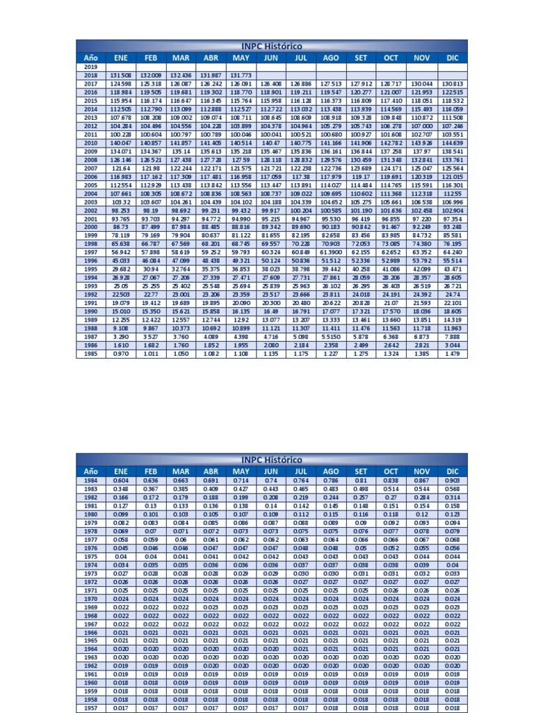 TABLAS DE INPC Y RECARGOS 2020 SALARIO MIN Ene 2000 Feb 2000 Mar 2000 Abr 2000 May 2000 Jun 2000 Jul 2000 Ago 2000 Sep. Se maneja el inmediato anterior antes de su publicacin en el Diario Oficial de la Federacin. INPC 2018 Actualizado.